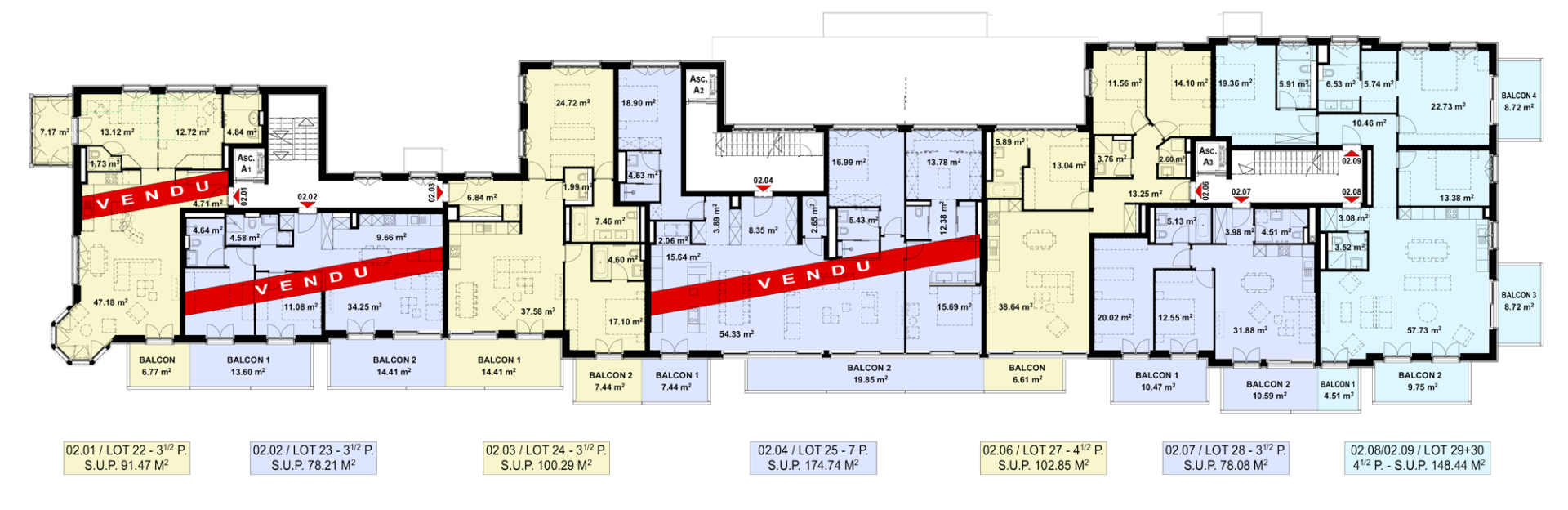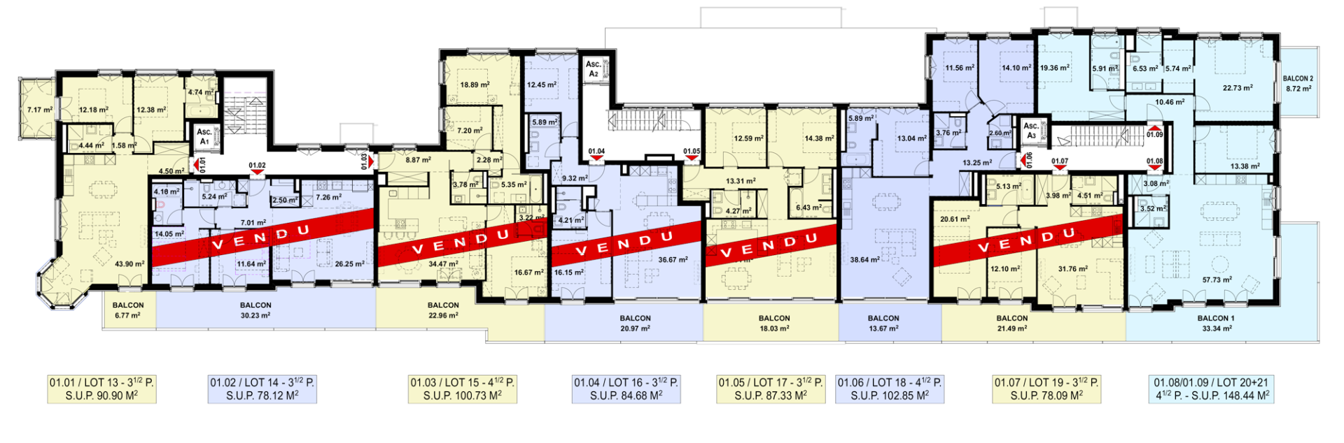| Lot | Pièces | Surf. int. / PPE | Surface pondérée | Prix | ||||